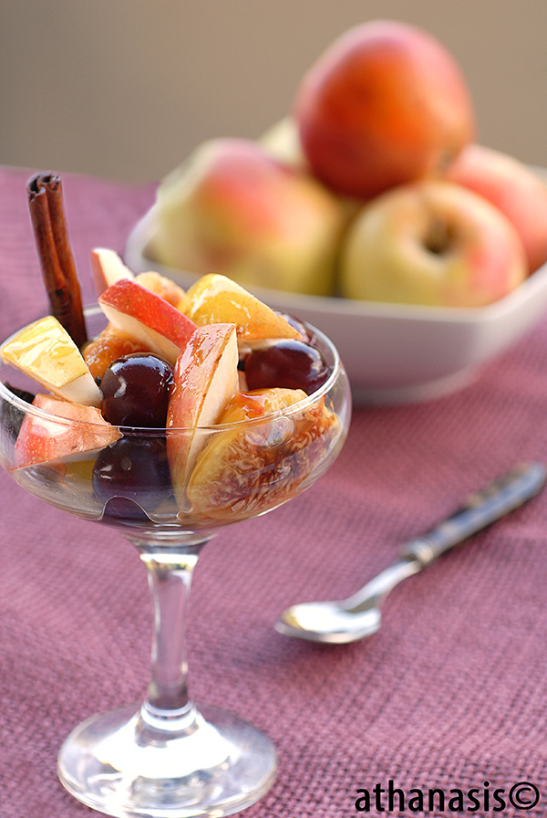 Μεθυσμένα φρούτα φθινοπώρου με σάλτσα κρασιού .