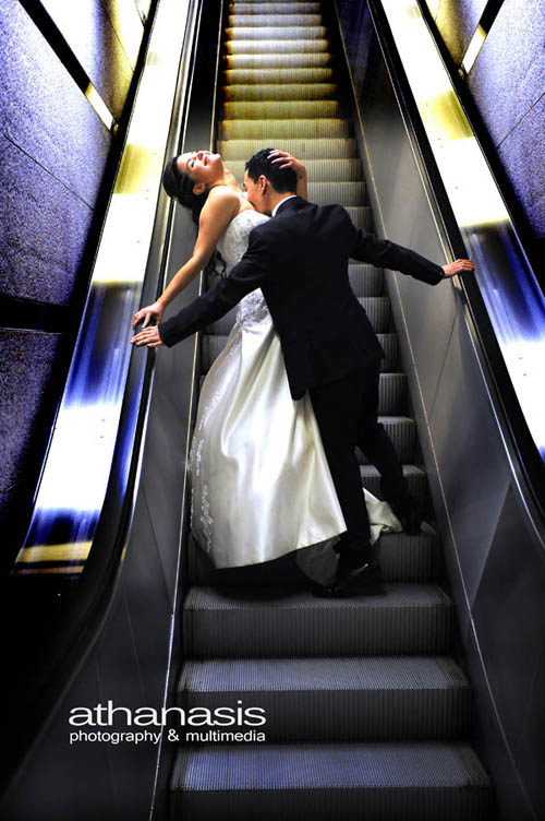 Δουλεύω χρόνια σε περιοδικά κι έχουν περάσει από μπροστά μου αμέτρητες φωτογραφίες. Ο φακός του Αθανάσιου έχει κάτι το ξεχωριστό. Εδώ μεταμορφώνει τον παγωμένο, στιλπνό και απρόσωπο χώρο ενός σταθμού του Μετρό σε σκηνική φαντασμαγορία. Οι φωτογραφίες δημιουργούν από μόνες τους μια νέα αισθητική κατηγορία. Αυτή του μεταβιομηχανικού ρομαντισμού. Ο συρμός εισβάλλει στο φόντο ως άλλος “πυρίδρομος έρως” των Ορφικών… Οι μπλε γόβες της νύφης κυριαρχούν φετιχιστικά πάνω σε γρανίτες και μέταλλα… Το βύθισμα του γαμπρού στο ντεκολτέ της καθώς ανεβαίνουν… Η γραβάτα-χαλινάρι στο λαιμό του την ώρα της άφιξης στο κοινό τους μέλλον… Η ελληνική φωτογραφία σε μεγάλες στιγμές.